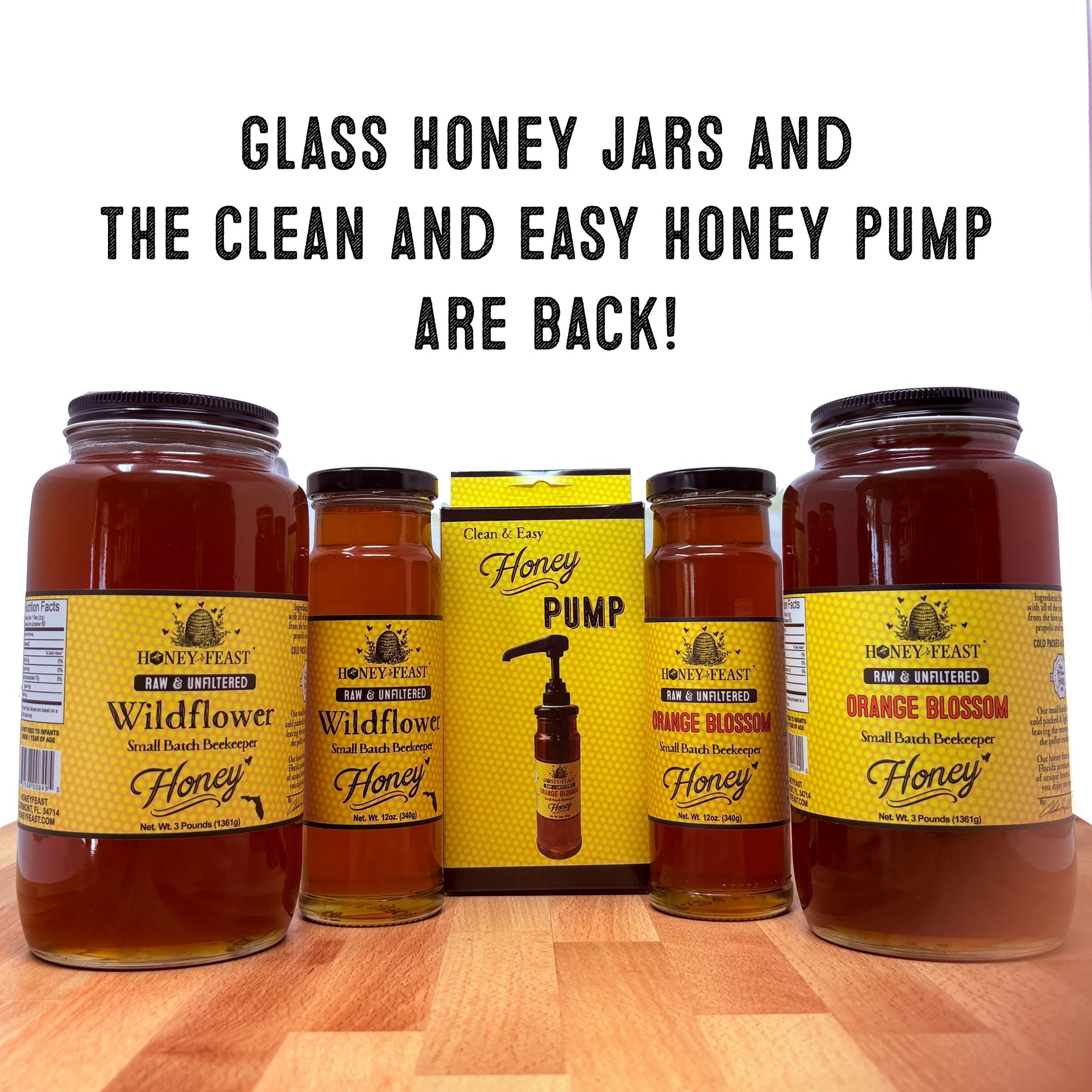 Starting today, you can once again enjoy Honey Feast’s raw Wildflower and Orange Blossom honeys in beautifully crafted 12oz and 3lb glass jars. These jars don’t just look great—they help preserve the purity, flavor, and texture of our unfiltered, cold-packed honey.