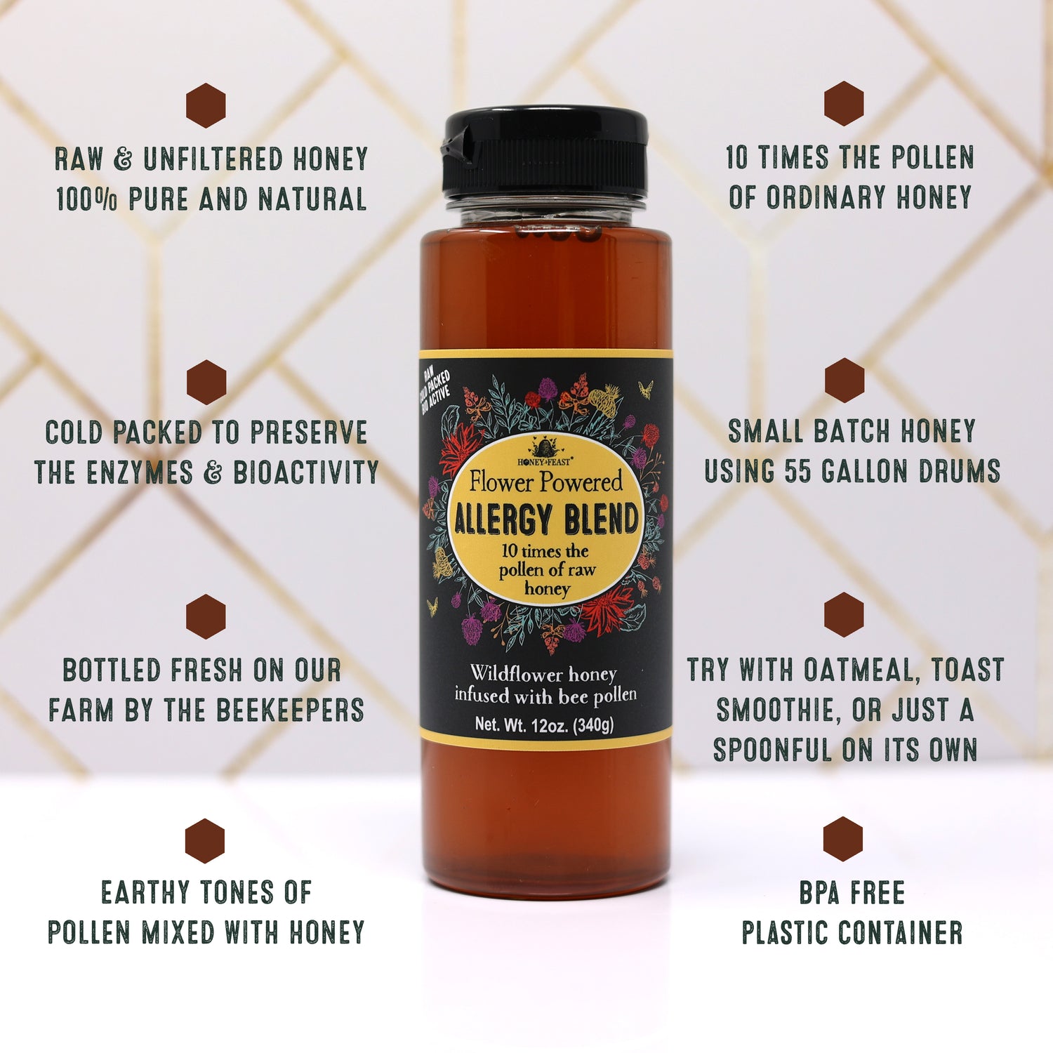 Indulge in our raw and unfiltered Allergy Blend Honey, sourced from dedicated beekeepers across the United States. This 6lb bulk jar is packed with essential nutrients, enzymes, and antioxidants, making it the ideal choice for a healthy and flavorful sweetener. Proudly celebrating the diversity of American flora, HONEY FEAST's honey is a raw and pure product that supports local beekeeping and provides a taste of the land. Use it in your recipes or as a wholesome sugar alternative to elevate your taste buds.
