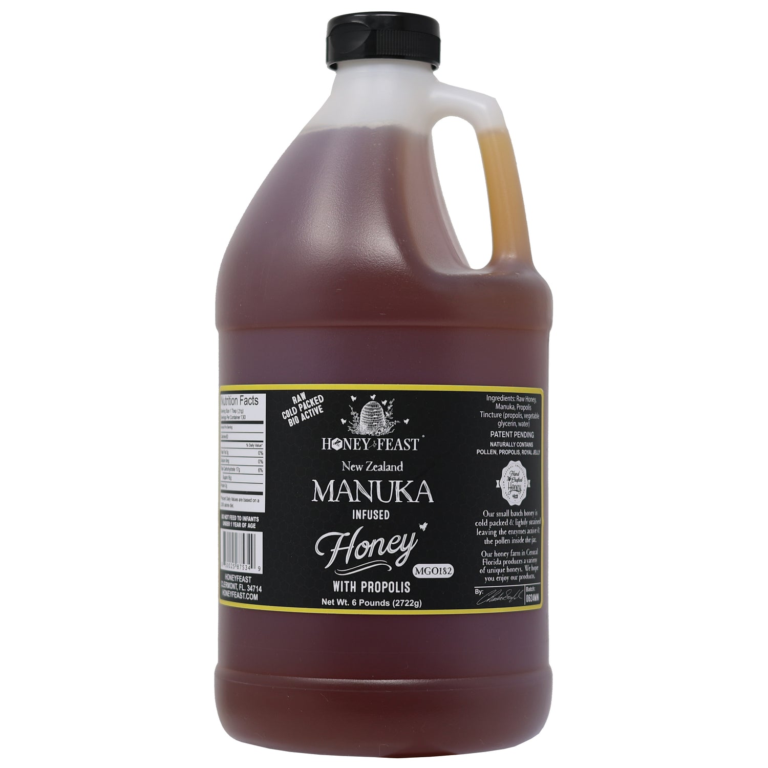 Try HONEY FEAST's raw Manuka and propolis-infused honey for a powerful blend that is perfect for your daily needs. Unheated and unfiltered, this premium honey is infused with Manuka that is sourced from the pristine landscapes of New Zealand, ensuring maximum health benefits with its pure nutrients and enzymes. Enjoy the value and convenience of a 3lb jar for all your culinary and wellness needs. Rest assured, our honey has passed European Manuka MGO testing standards with a rating of MGO182, guaranteeing its authenticity and quality.