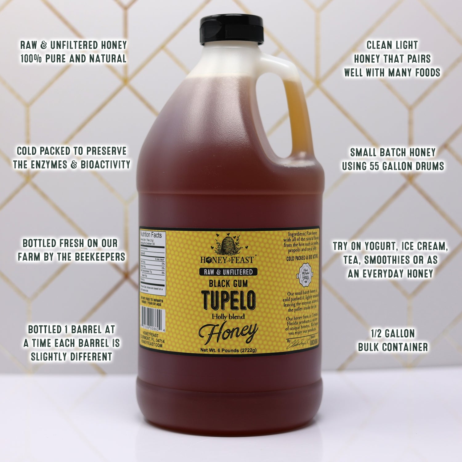 Indulge in our unique 3lb Tupelo Honey made by our family apiary in Central Florida. Sourced from Black Gum Tupelo and Holly blend, our bees create authentic and raw honey during nectar flow. Perfect for adding a touch of sweetness to your tea, toast, or favorite recipes, our honey comes in a bulk size ideal for stocking up or gifting to loved ones. Discover the exceptional quality and taste of Honey Feast's Tupelo Honey today.