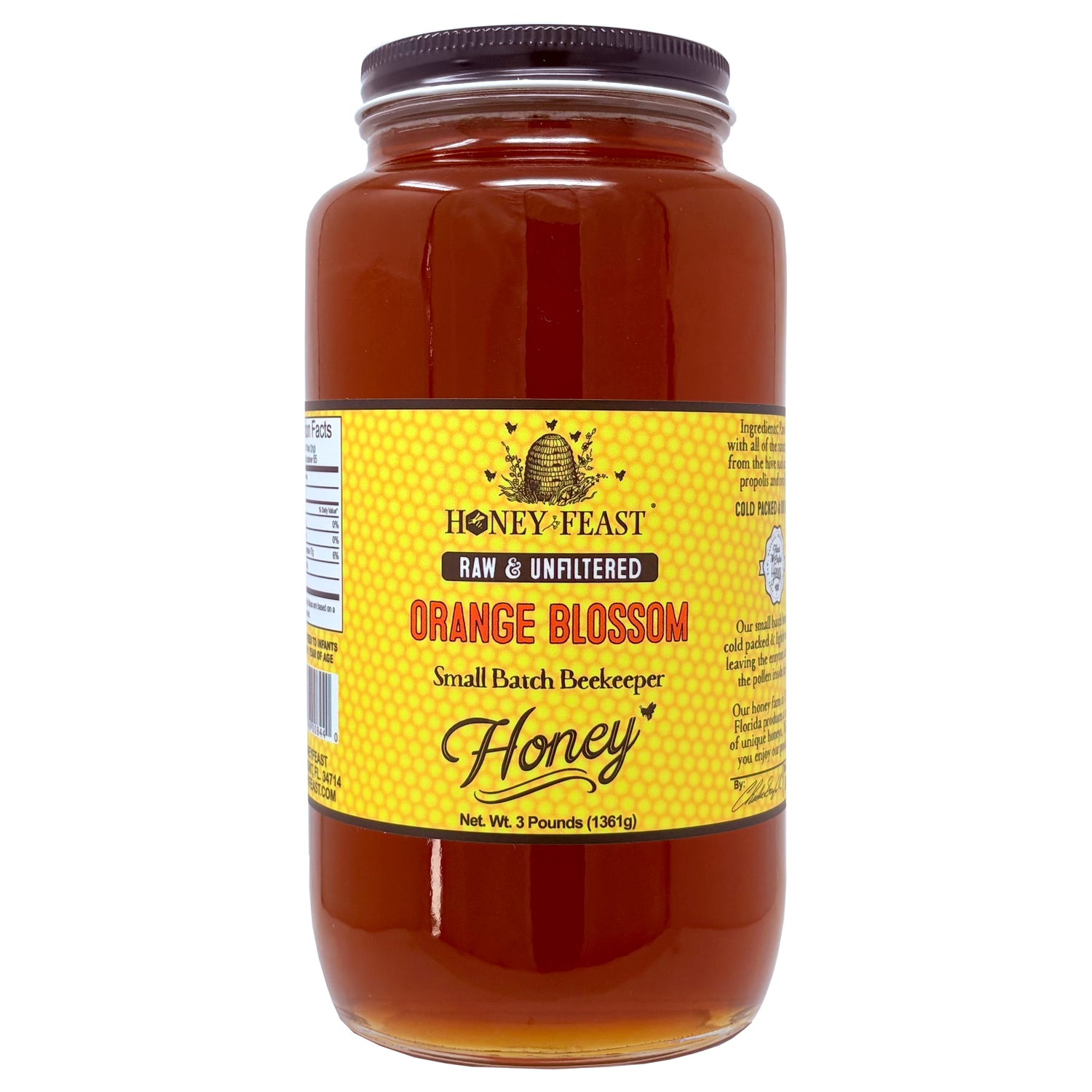 Experience the delicious, citrus-infused flavor of HONEY FEAST's Orange Blossom Honey. Perfect as a pantry staple or a thoughtful gift for honey lovers, our 3lb jug of raw, unfiltered honey is sustainably harvested from happy bees. 100% pure and natural, with no additives or artificial sweeteners, our honey supports bee conservation and can be used in various creative culinary uses. Try it today and indulge in the best natural honey!