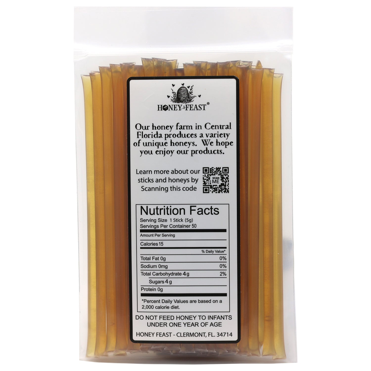Introducing Honey Feast Black Gum Tupelo Honey Sticks 50-pack: a delicious and convenient way to enjoy the authentic taste of Florida's Black Gum Tupelo and Holly blend. Made with care and expertise from our own onsite bees at our Central Florida apiary, our honey sticks offer a unique and flavorful addition to tea time or as a quick on-the-go snack. Share the exceptional taste of Tupelo Honey with our 50-pack honey sticks, perfect for any occasion.