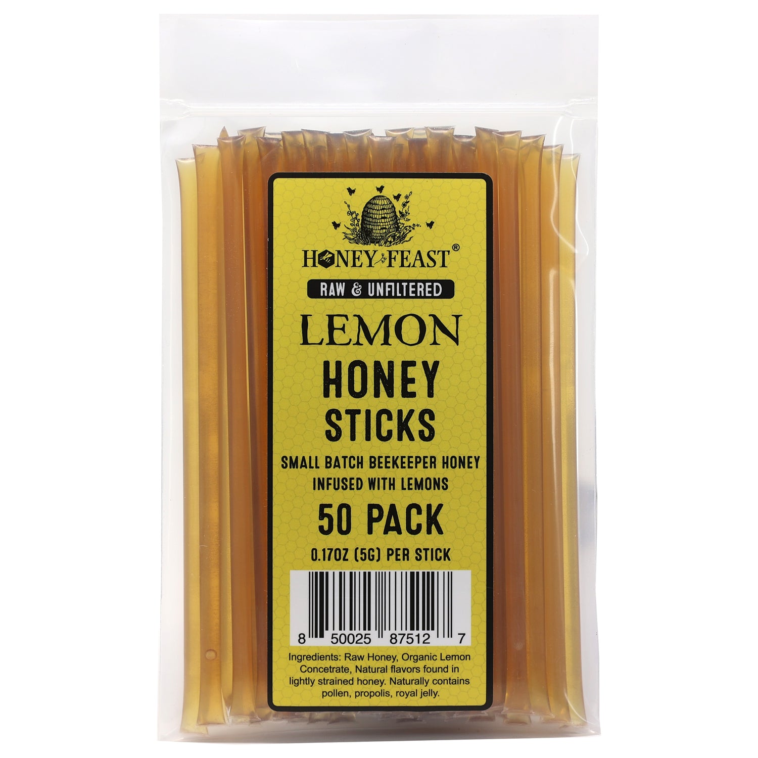 Get ready for an irresistible treat with HONEY FEAST Organic Lemon Honey Sticks! Made with organic lemons from Central Florida, raw honey, and packaged in a 50-pack, these sticks are perfect for on-the-go snacking, tea, coffee, or as a gift.