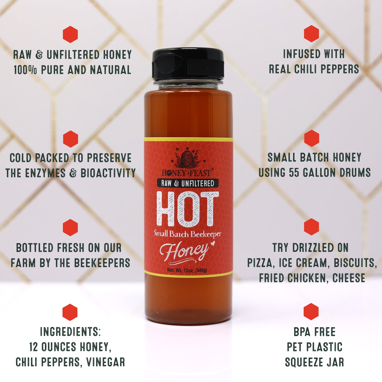 Discover the perfect blend of sweet and heat with HONEY FEAST's Hot Honey 6-pack. Each 12oz jar brings a unique flavor experience, ideal for elevating any dish. Perfect for gifting to food enthusiasts or as a gourmet treat, this collection of spicy honeys is a must-have for any kitchen.