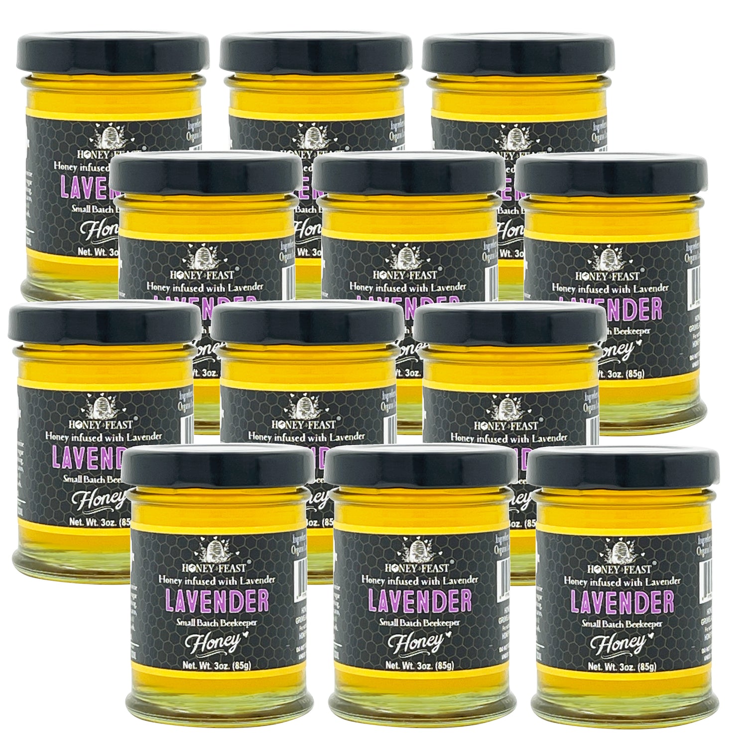 Indulge in artisanal Lavender Honey - perfect for gifting tea lovers, foodies, and those who appreciate pure, natural flavors. Hand-bottled in Florida, this pack of 12 is perfect for weddings, events, or as a special treat. Experience the delicate flavor and soothing aroma of Lavender in every 3oz jar of Honey Feast.