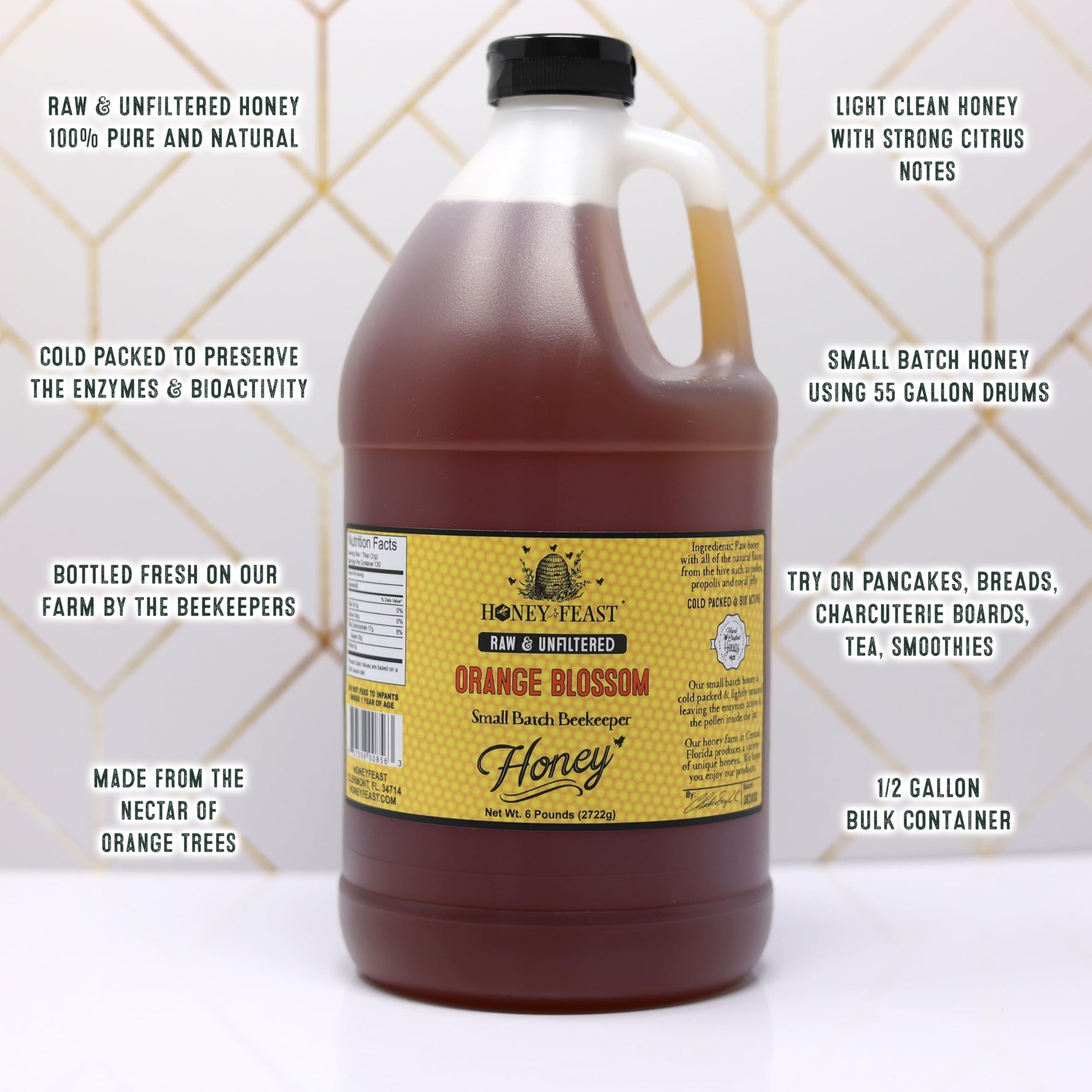 Indulge in the rich, citrus-infused sweetness of HONEY FEAST Orange Blossom Honey and enjoy the benefits of raw, unheated honey in every generous 6 lb jar.