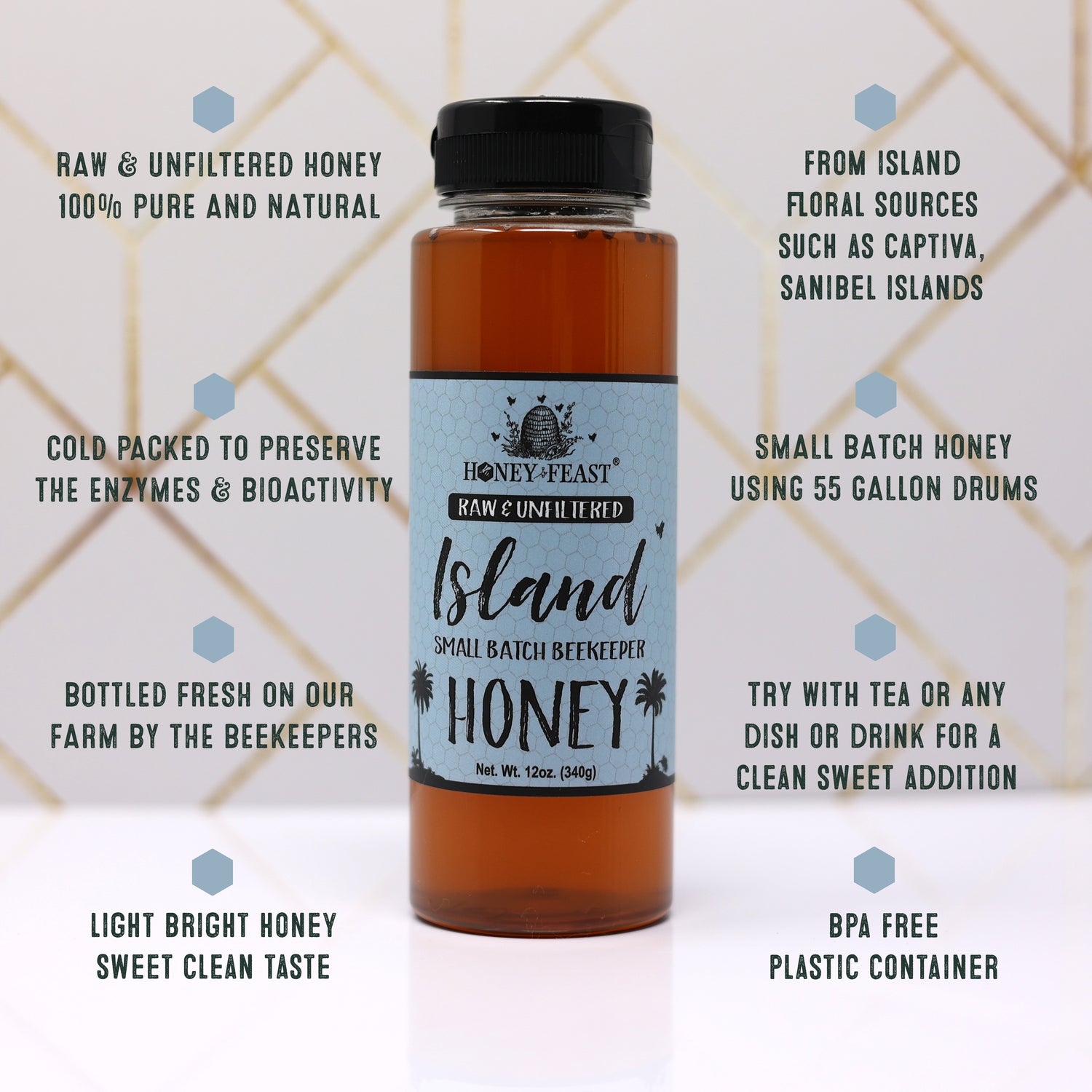 Experience island paradise with Honey Feast's Island Honey 12oz. Sourced from picturesque islands surrounding Sanibel, our renowned honey is handcrafted with care on our 15-acre apiary in Central Florida and cold-packed to preserve its natural goodness. Taste the diverse flavors and support sustainable beekeeping practices with each jar of our Island Honey. Order today!