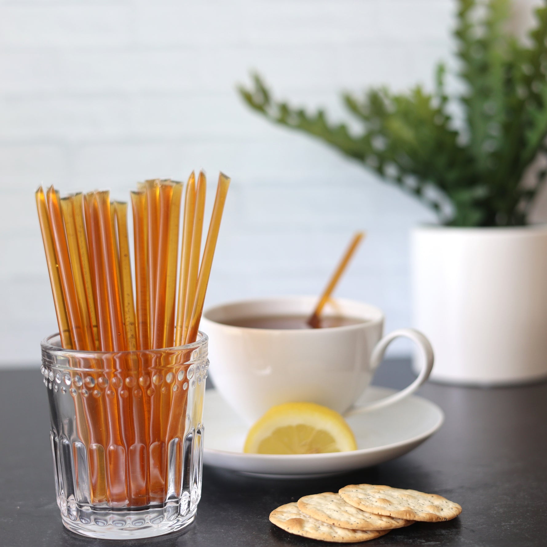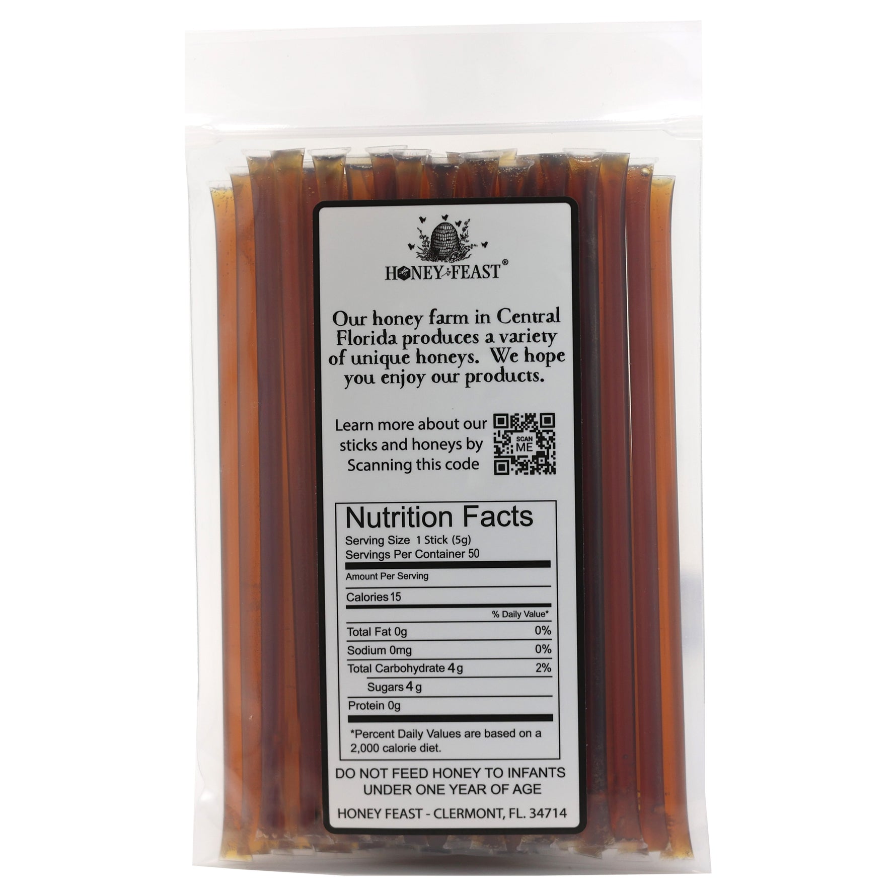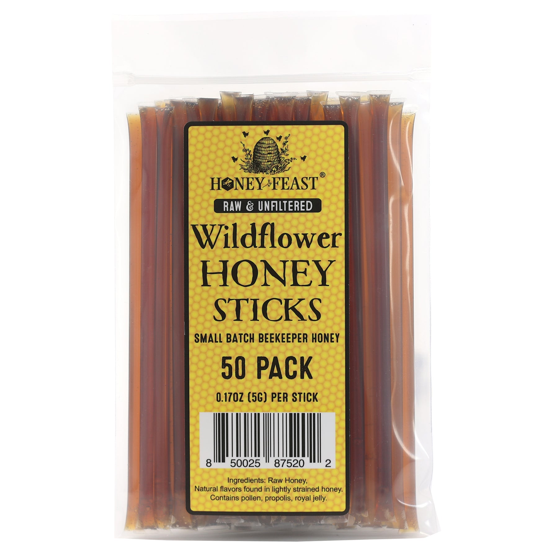 Transform your tea time with HONEY FEAST's Wildflower Honey Sticks. Our honey sticks are filled with pure, raw Florida honey, sourced from local bees and untouched by artificial additives. The raw, unfiltered nature of this honey preserves its naturally occurring beneficial compounds, delivering an authentic and delicious flavor. These honey sticks, also known as honey straws, offer the perfect blend of convenience and taste. Individually wrapped to maintain freshness and quality, they make for a convenient honey spoon when you're brewing a cup of tea or looking for a natural sweetener for your meals. Replace your typical raw sugar packets with our honey sticks for tea and experience a healthier sweetness. Not only do these honey sticks taste great, but they also offer wholesome nutrients and natural antioxidants. Sourced from American honey bees in Florida, they are a testament to our commitment to quality and delivering the best local honey to your table. Besides being a perfect addition to your tea, these honey sticks are also versatile and organic.