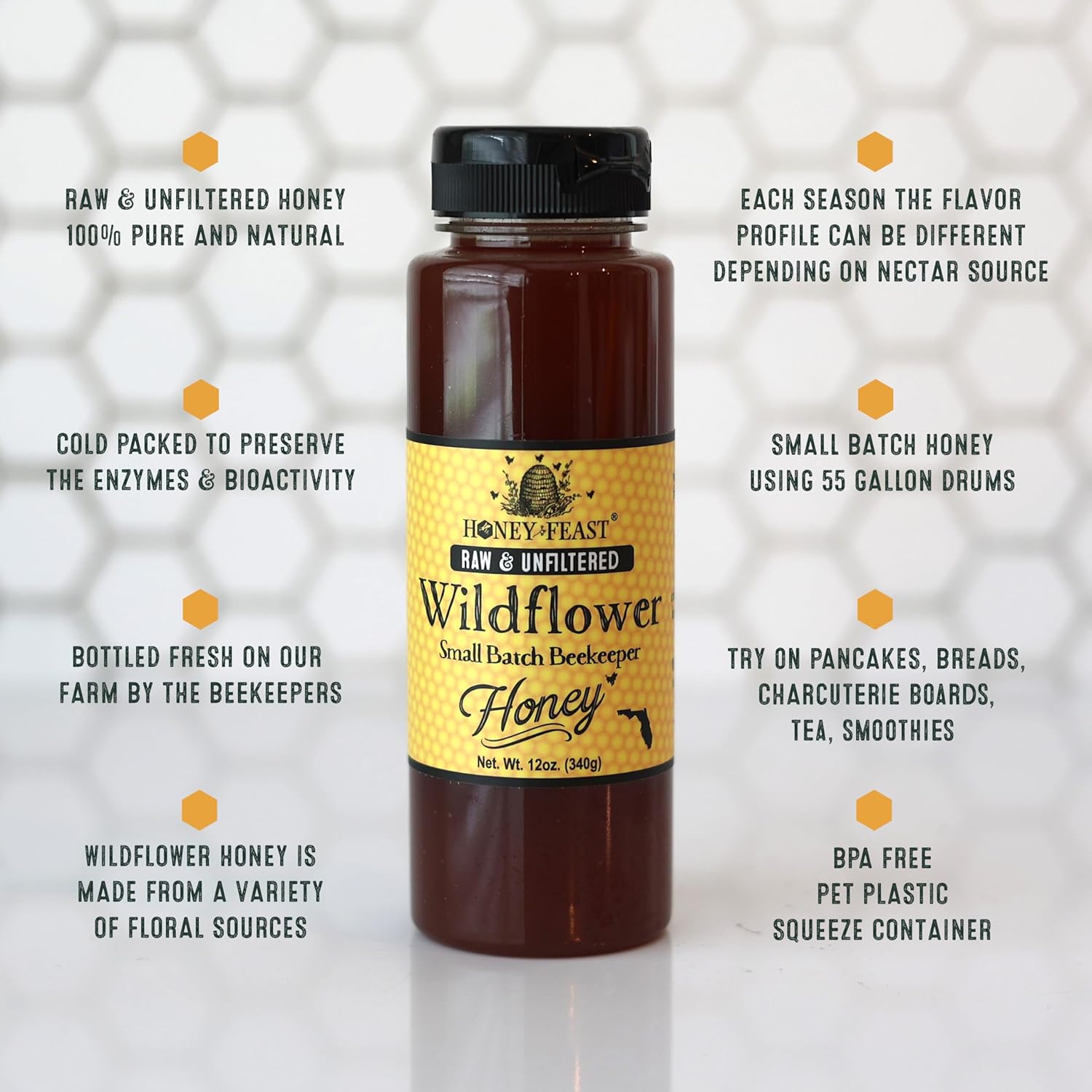 Experience the raw and unfiltered taste of nature with our Wildflower Honey 48-pack, featuring 12oz jars that showcase a variety of flavors and pollens from the seasons. Our honey is gently strained to preserve its natural enzymes and pollen, straight from our organic farm to your table. Taste the purity of sustainable farming with Honey Feast..