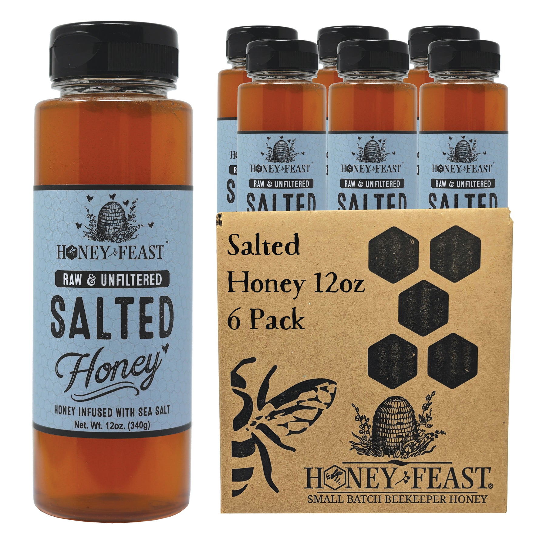 Indulge in the exquisite blend of sea salt and honey with HONEY FEAST Salted Honey. This six-pack offers versatile use as a unique condiment or topping, perfect for elevating any dish. Treat yourself to the sophisticated salted caramel flavor and elevate your meals with this premium salted honey. It also makes for a thoughtful gift for any gourmet enthusiast or culinary adventurer. Discover the harmonious fusion of flavors in each 12oz jar and elevate your cooking experience.